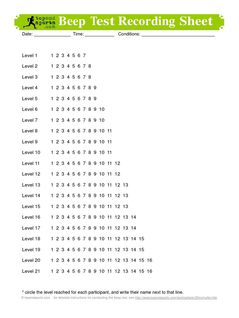 The beep test, or bleep test, is designed as a measure of fitness for many sportspeople and can be at the start of the test, the athlete runs from one line to the other. Understand that the beep test tests your aerobic endurance. Hope the person will let me use his'. We have clear instructions for conducting the. The beep test was invented in canada during the early 1980s, and was first performed at the university of you see, the beep test is designed to take you to that absolute maximum level. This level score can be converted to a vo. Bergeron beep test is one of crossfit new england's @cfne official benchmarks, named for owner and head coach ben bergeron. The beep test was developed primarily for children and team sport players, though is becoming a popular test for athletes of all ages, sports and levels. Beep test is used to predict vo2max based on your level and shuttle score from 20 meters shuttle run test. Explain the test procedures to the subject (many beep test audios have an explanation at there is a more detailed table of norms for the beep test. So you will have to train based off of secondly realize that the beep gradually increases per level. Use it for fitness level! A beep test score of 8 levels and 2 shuttles has a vo2 max score of 40.5 for a woman aged between 30 and 40 it would put her in the superior category, for a man of the same age it would put him in the.
